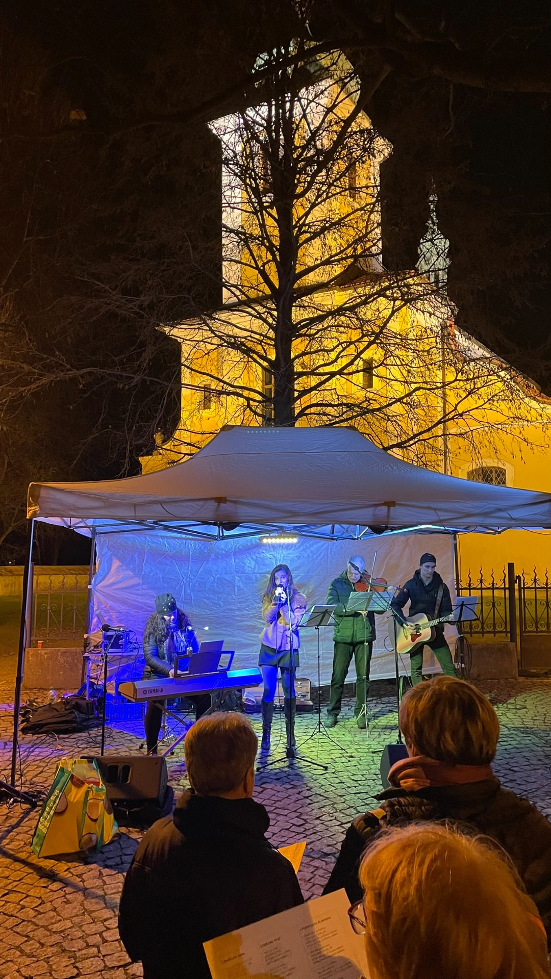 Ve středu 10. prosince 2025 jsem měl opět tu čest zajišťovat ozvučení tradiční adventní akce Česko zpívá koledy na Vinořském náměstí před kostelem. Atmosféra byla výjimečná – zimní večer, nasvícený kostel a postupně se scházející lidé vytvořili krásné kulisy pro společné zpívání.
